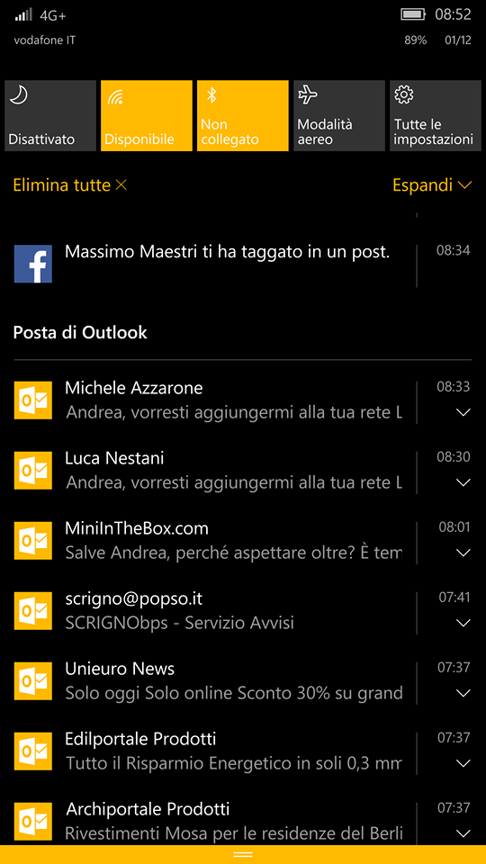 Il Lumia ha 2 account google configurati in push, 1 account mail imap in pull ogni 15 minuti, facebook, whatsapp, 6tag (instagram) e metweets attivi oltre a skype e al fitbit charge HR come wearable bt attivo.