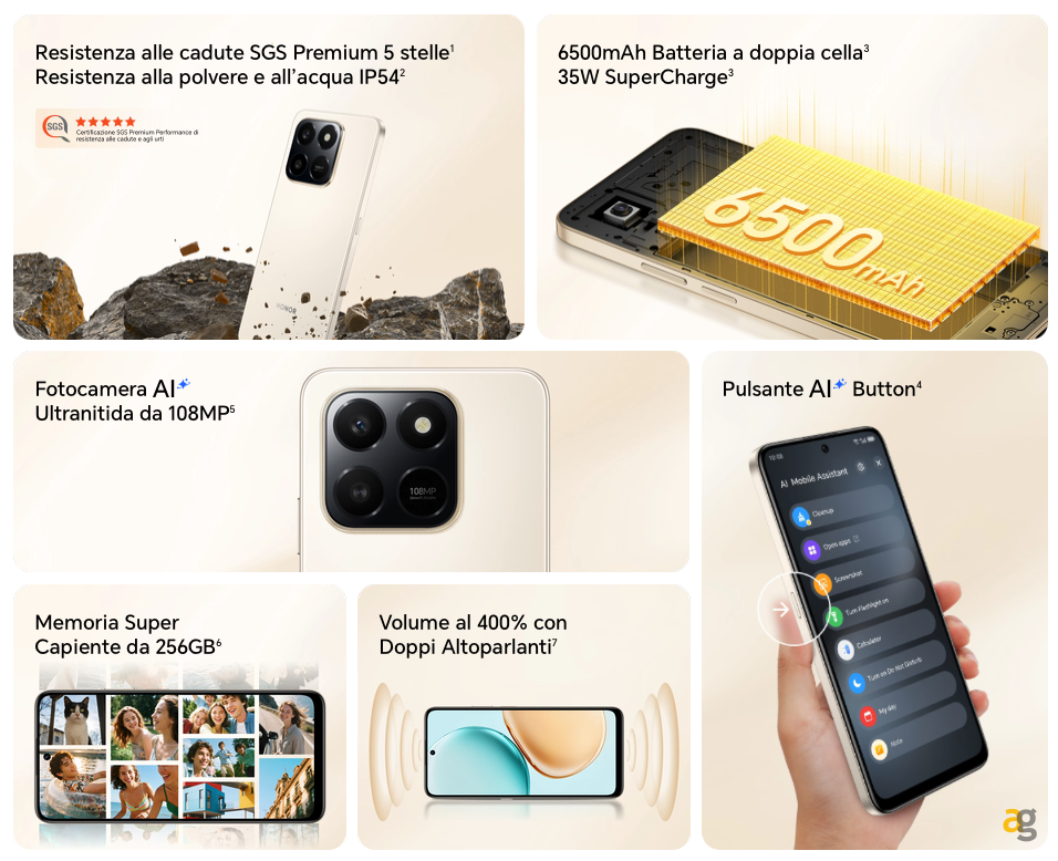Il cuore energetico del dispositivo è rappresentato da una batteria a doppia cella da 6500 mAh. Secondo il produttore, questa capacità è studiata per garantire un’autonomia prolungata e per mantenere le prestazioni nel tempo, con una longevità operativa che potrebbe estendersi fino a cinque anni. Il supporto alla tecnologia HONOR SuperCharge da 35W permette una ricarica rapida. Un sistema di monitoraggio avanzato assicura inoltre il funzionamento anche in condizioni climatiche difficili, con un range operativo dichiarato tra -20 °C e +55 °C.